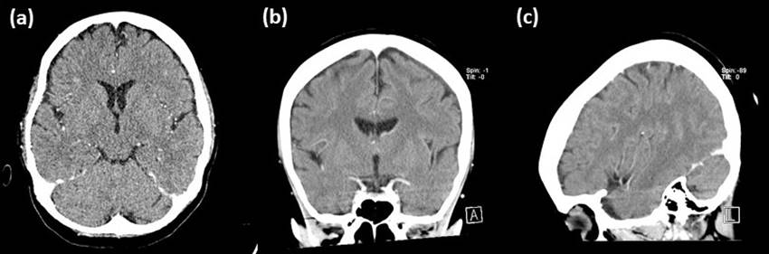 Figure 2: Interval computed tomography 2 weeks after treatment showing marked improvement of left subdural collection. (a) axial view, (b) coronal view and (c) sagittal view.