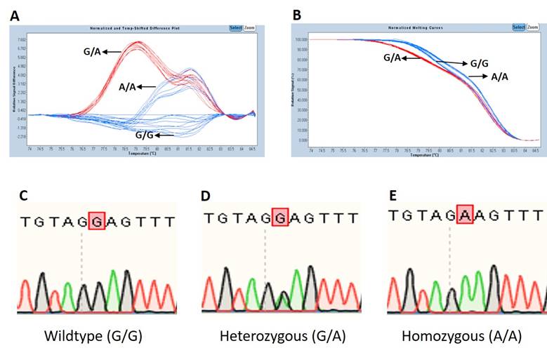 Figure 1. A representative result of (A) the temperature shifted difference plot of DAT1 rs40184 and (B) the normalised melting curves of DAT1 rs40184. (C) A representative result of the sequencing of DAT1 rs40184 for the wildtype genotype G/G, (D) the heterozygous genotype G/A and (E) the homozygous genotype A/A.